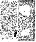 А – клетка животного происхождения; В – растительная клетка: 1 – ядро с хроматином и ядрышком; 2 – клеточная (плазматическая) мембрана; 3 – клеточная оболочка; 4–плазмодесмы; 5 – гранулярная эндоплазматическая сеть; 6 – гладкая (агранулярная) эндоплазматическая сеть; 7 – пиноцитозная вакуоль; 8 – комплекс Гольджи; 9 – лизосома; 10 – жировые включения в гладкой эндоплазматической сети; 11 – центриоль и микротрубочки центра сферы; 12 – митохондрии; 13 – полирибосомы гиалоплазмы; 14 – вакуоли; 15 – хлоропласты.