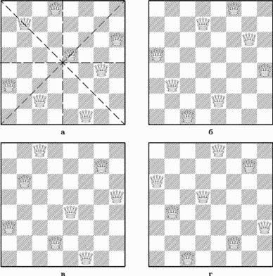 Из каждого решения задачи о ферзях можно получить ряд других при помощи поворотов (вращений) доски на 90, 180 и 270°, а также при ее зеркальном отражении относительно линий, разделяющих доску пополам. Например, из расстановки, показанной на рис. а, при повороте доски на 90° по часовой стрелке мы получаем расстановку на рис. в, а при отражении доски относительно линии, разделяющей королевский и ферзевый фланги, – на рис. г. При помощи других поворотов и отражений доски можно получить еще пять решений.