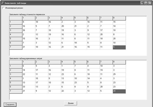В появившемся окне, необходимо заполнить таблицы стоимости перевозок и временных затрат, так же в этом окне пользователь может выбрать "Инженерный