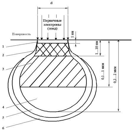 Области генерации: 1 – Оже-электронов, 2 – вторичных электронов, 3 – отраженных электронов, 4 – характеристического рентгеновского излучения, 5 – тормозного рентгеновского излучения, 6 – флуоресценции