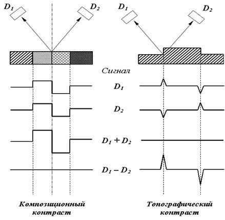 В том случае, когда поверхность образца имеет ярко выраженные неровности, то дополнительно к композиционному возникает топографический контраст. Для разделения композиционного и топографического контрастов применяют два детектора отраженных электронов Эверхарта-Торнли.