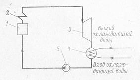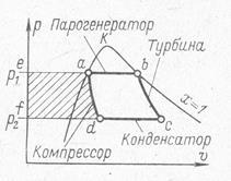 Установка, що працює за циклом Карно, повинна складатися з парогенератора, парової турбіни, компресора й конденсатора. Ізобарно-ізотермічний процес здійснюється в парогенераторі, в якому за рахунок підводиться тепла кипляча рідина стану переходить в суху насичену пару стану видання . Отримана пара по адіабати розширюється в турбіні і здійснює роботу, яка на діаграмі зображується пл. і визначається за формулою