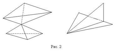 На рис.1 изображены объединения многоугольников, удовлетворяющие указанным требованиям и являющиеся многогранными поверхностями. На рис.2 изображены фигуры, не являющиеся многогранными поверхностями.