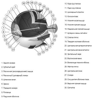 Глаз состоит из глазного яблока и вспомогательного аппарата. Глазное яблоко имеет не совсем правильную шаровидную форму и помещается в глазнице. Снаружи глазное яблоко покрыто белочной оболочкой - склерой, состоящей из соединительной ткани и имеющей белый цвет. Сзади в склере имеется отверстие, через которое входит зрительный нерв. Впереди склера прозрачна, более выпукла и образует прозрачную роговицу. Внутри склеры расположена вторая оболочка - сосудистая, снабженная кровеносными сосудами и пигментами. Передняя часть сосудистой оболочки находится за роговицей и образует радужную оболочку, в середине которой имеется отверстие - зрачок. Радужная оболочка снабжена мышцами, способствующими изменению просвета зрачка, она окрашена. Окраска зависит от наличия в ней пигмента: при большом количестве пигмента глаз имеет цвет - от коричневого (карий) до черного цвета, а серый, зеленоватый или голубой цвет объясняются недостаточностью пигмента. У альбиносов в радужной оболочке практически нет пигмента, глаза таких людей имеют красный цвет. За радужной оболочкой расположена прозрачная двояковыпуклая линза, имеющая форму чечевицы - хрусталик. Задняя сторона хрусталика более выпуклая. Сам хрусталик состоит из полужидкого вещества, находится в капсуле, прикрепленной с помощью связок к ресничному телу. Между роговицей и радужной оболочкой расположена передняя камера глаза, а между радужной оболочкой и хрусталиком - задняя камера глаза, в которых находится водянистая влага. Внутренняя полость глаза заполнена стекловидным телом. Стекловидное тело, роговица и хрусталик обладают лучепреломляющей способностью. Самая внутренняя оболочка (третья) глаза называется сетчатой оболочкой, или сетчаткой. Она имеет сложное строение - в ней различают 10 слоев клеток, особо важны палочки и колбочки. Место вхождения зрительного нерва называется слепым пятном (здесь нет палочек и колбочек), а место лучшего видения, где сосредоточены палочки и колбочки, называется желтым пятном. В центре желтого пятна есть углубление - центральная ямка.