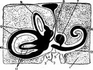 1 — кость; 2 — полость среднего уха; 3 —стремя;4 — окно преддверия; 5— окно улитки; 6 — улит; 7 и 8 — отолитовый аппарат (7 — саккулус или круглый мешочек; 8 — утрикулус, или овальный мешочек); 9, 10 и 11 — полукружные каналы 12 — пространство между костным и перепончатым лабиринтами, заполненное перилимфой.