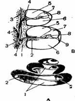 В — схема поперечного разреза части улитки; — костный стержень;2 — спиральная костная пластинка; 3 — волокна улиткового нерва;4 — скопление тел первого нейрона слухового проводящего пути; 5 — лестница преддверия; 6—лестница барабана; 7— улитковая часть перепончатого лабиринта;8 — кортиев орган; 9 — основная пластинка.