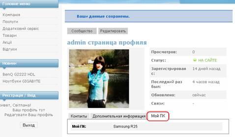 Так як наш сайт спеціалізується на комп’ютерах, то можна додати блок «ПК користувача». Заходимо на вкладку Управління блоками – Новий блок. Задаємо заголовок нашого блоку, якщо необхідно, то описуємо цей блок в графі Коментар і зберігаємо. Для того, щоб наш блок виводився необхідно додати ще поля, які користувач заповнюватиме. Заходимо на вкладку Управління полями – Нове поле, де потрібно задати: тип (в нашому випадку просто текст); блок, до якого це поле відноситься; назву поля; заголовок; опис даного поля; чи відображатиметься це поле при реєстрації (ми обираємо Ні); розмір і максимальну довжину поля; слова, які заборонені при реєстрації і слова, які заборонені при редагуванні цього поля. Коли ми все необхідне ввели – зберігаємо. І одразу введемо наші дані в блок (Рис.23) :