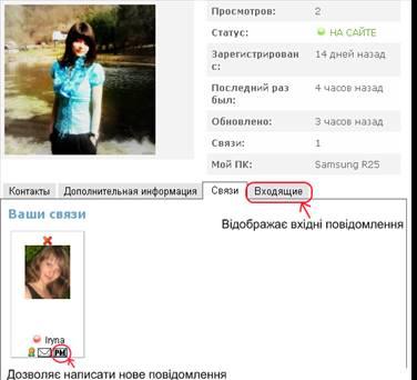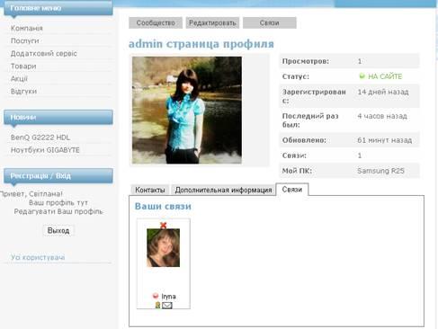 Тепер зайдемо під другим користувачем (Ірина), там появилась вкладка Зв’язок і встановлюємо зв’язок з попереднім користувачем (Admin), який повинен буде підтвердити цей зв’язок. Можна спочатку переглянути сторінку, того хто просить встановити зв’язок і тоді вирішувати чи підтверджувати чи ні (Рис.28):