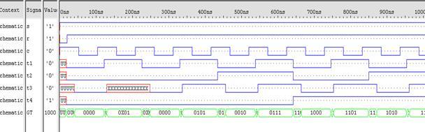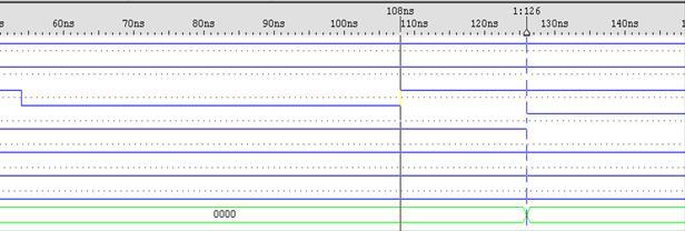 Для правильної роботи лічильника, необхідно правильно задати вхідні сигнали, лише при цій умові вихідні сигнали будуть вірними. На R(анг. Reset – скинути)-вхід необхідно подати короткочасний «0» , на S(анг. Set – встановити) подаємо постійну одиницю, а на C(синхронний)-вхід подавати періодичний сигнал з періодом починаючи від 60нс. Дана схема нормально функціонує при 60нс, зображено на рисунку 3.2. Але це не мінімальний період. Тому, методом підбору, визначаємо, що мінімальний період має 53нс, роботу лічильника при мінімальному періоді зображено на рисунку 3.3.