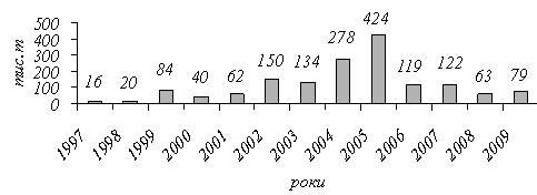 На підприємствах області протягом 2008 р. утворилось 79,2 тис. т відходів І–ІІІ класів небезпеки, що на 16,3 тис. т більше порівняно з 2008 р. (рис. 2.1.). Основна частина утворених відходів (51,7 тис. т, або 65,3 % від загального обсягу) належить до ІІ класу небезпеки. Відходи ІІІ класу небезпеки склали 26,8 тис. т і І класу – 0,7 тис. т (рис. 2.3.).