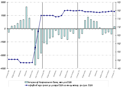 Рис.2.2 Динаміка офіційного курсу гривні до долара США та інтервенції НБУ у 2008 - 2011р. [23]
