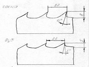 а- відстань бід вершини зуба до центра радіуса закруглення впадини, мм; g - передній кут зуба, град; b - кут загострення зуба, град.