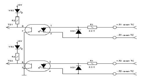 Гальванічна розв'язка вхідних ланцюгів комп'ютера й пристроїв СЦБ забезпечується застосуванням оптоелектронних елементів-DA (рис. 3.5). Знімання сигналів ТС здійснюється із клем підключення контрольних ламп пульт-табло ЕЦ через резистори R1, що огороджують струм (2,2 кОм).