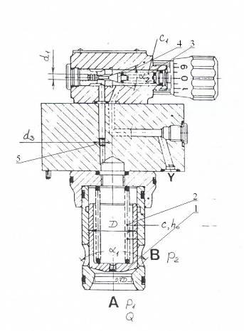 Когда давление р превышает значение, установленное пружиной 3, конус 4 приподнимается, жидкость через дроссель 5 идет на слив, на дросселе возникает перепад давления, под действием которого клапан 1 поднимается, открывая проходное сечение и перепуская расход рабочей жидкости Q на слив.