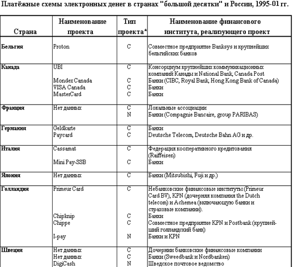 В таблице 2 перечислены основные проекты в области электронных денег, реализованные в странах “большой десятки” и России в 1995-2001 гг. Таблица позволяет сделать вывод о том, что наибольшее количество проектов по внедрению электронных денег реализуется в США, Канаде и Голландии. Анализ российских разработок в области электронных денег будет проведён позднее.