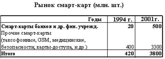 Как видно из таблицы 1, потенциальный рынок банковских и других смарт-карт с финансовыми приложениями к 2002 г. составит около 500 млн. шт., если сюда включить смарт-карты технологических и телекоммуникационных компаний, которые в настоящий момент активно эмитируют смарт-карты.