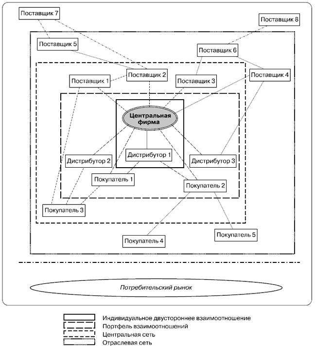 В процессе разработки данной схемы были также учтены модели, разработанные Я. Андерсоном с соавторами [Anderson, Hakansson, Johanson, 1994] и усовершенствованные К. Алайоутсиярви [Alajoutsijarvi, Möller, Rosenbroijer, 1999]. При этом на предложенной нами схеме кроме центральной фирмы и уровней индивидуальных двусторонних взаимоотношений и центральной сети специально выделены уровни портфеля взаимоотношений и отраслевой сети.3