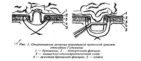 После вправления грыжевого содержимого в брюшную полость грыжевой мешок перекручивают по его продольной оси 2-3 раза, прошивают кетгутом для предупреждения раскручивания и вправляют его в брюшную полость. Грыжевое кольцо зашивают узловатыми швами типа Ламбера, после чего зашивают кожную рану. Данный способ имеет преимущество перед способом Гутмана в том отношении, что устраняет не только необходимость ампутации грыжевого мешка, но и опасность выпадения кишок под кожу в случае разрыва шва, наложенного на грыжевое кольцо.