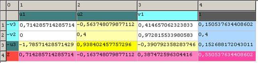 3) Матриця мір неоптимальності заміняється еквівалентною їй матрицею додаванням до кожної міри неоптимальності , тобто найбільшого з абсолютних значень всіх мір. Якщо таке найбільше значення рівне нулю, то всі міри рівні нулю, і в такому випадку замість нього до усіх мір додається число 1. В результаті отримуємо матрицю з невід’ємними елементами. На головній діагоналі усі вони рівні максимальному значенню. Така заміна матриці не змінює рішення гри, змінює тільки її ціна. Тобто тепер гра має вигляд не гри програшів, а гри з пошуком максимального виграшу. Для пошуку оптимальної стратегії для першого гравця гра подається як пара взаємнодвоїстих однокритеріальних задач ЛП. Для першого гравця потрібні значення змінних двоїстої задачі :