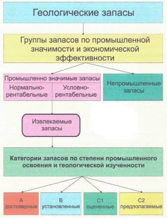 Промышленно значимые нормально-рентабельные извлекаемые запасы по сумме критериев - экономической эффективности, степени геологической изученности и промышленного освоения подразделяются на четыре категории запасов - достоверные - категория А; установленные - категория В; оцененные - категория С ; предполагаемые -категория С (рис. 1.1).