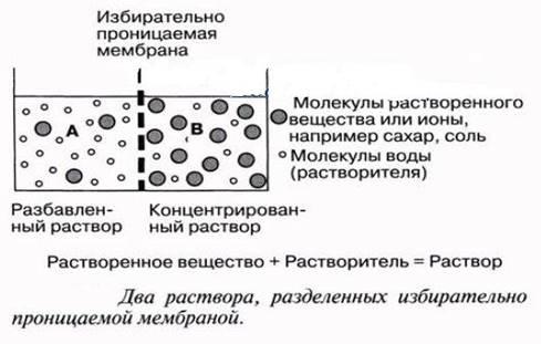 Осмос играет важную роль во многих биологических процессах. Мембрана, окружающая нормальную клетку крови, проницаема лишь для молекул воды, кислорода, некоторых из растворенных в крови питательных веществ и продуктов клеточной жизнедеятельности; для больших белковых молекул, находящихся в растворенном состоянии внутри клетки, она непроницаема. Поэтому белки, столь важные для биологических процессов, остаются внутри клетки.