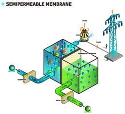 Принцип действия соляной электростанции основан на явлении, известном как осмос: молекулы воды переходят из отсека с пресной водой в отсек с с морской водой, стремясь выровнить концентрацию соли по обе стороны полупроницаемой мембраны; при этом увеличивается объем воды в отсеке с морской водой и создается избыточное давление, которое заставляет генератор вырабатывать электричество.
