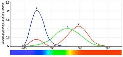 Заметим, что это нормализованная чувствительность. В абсолютных значениях чувствительность палочек примерно вдвое превосходит максимальную чувствительность колбочек, а сами колбочки активно подстраиваются под освещение и почти никогда не обладают одинаковыми максимумами чувствительности [11].