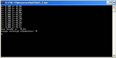 Для заданной функции y = cos(0.5x/2)+cos(x) вычислить массив 11 ее значений в равноотстоящих точках интервала [2,4]. Вывести на экран таблицу значений функции. Обработать массив значений функции указанным образом. Результаты вывести на экран.Найти квадрат максимального из четных элементов массива и общее число нулевых элементов.