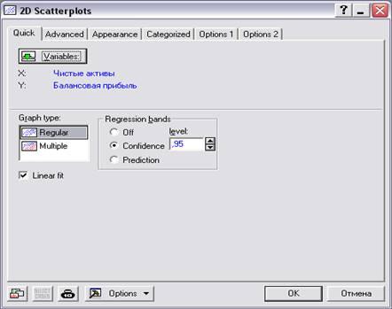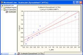 Построим график линейной функции с доверительными интервалами. Для этого в меню Graphs/Scatterplits необходимо указать переменные, линию уровня и доверительные интервалы (рис. 3).