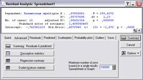 Кнопка анализа ошибок Summary: Residuals & Predicted показывает наблюдаемые значения зависимой переменной (Observervalue), теоретические значения зависимой переменной (Predictedvalue) и ошибки модели (Residual) как разность наблюдаемых и теоретических значений (рис.6).