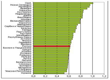 В 2002 году рождаемость в России обеспечивала воспроизводство населения всего на 62%, но при этом Россия не была исключением из общего правила. Уровень рождаемости не был достаточен для простого воспроизводства населения ни в одной из промышленно развитых стран, за исключением США, в 15 европейских странах нетто-коэффициент воспроизводства населения был даже ниже, чем в России (рис. 1).