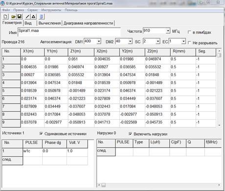 Для задания геометрии спиральной антенны была использована программа, которая по основным параметрам антенны и экрана рассчитывает начальные и конечные координаты линейных отрезков (сегментов), на которые они разбиваются, и создает файл с расширением *.maa. Дальнейший расчет производится в программе MMANA.