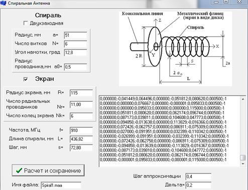 В программе исходными данными для спирали являются: радиус, число витков, угол намотки, радиус проводника, шаг аппроксимации. Для экрана: радиус, число радиальных проводников, число колец экрана, дельта – размер ячейки относительно длины волны. Также задается: частота и имя выходного файла. Для начала работы следует нажать кнопку “Расчет и сохранение”. Файл с заданным именем создается в папке с программой.