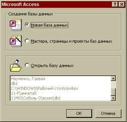Після запуску програми Microsoft Access на екрані з’являється вікно додатка, a також діалогове вікно, в якому користувач має вибрати один із наступних варіантів роботи: створення порожньої бази даних (перемикач Нова база даних),