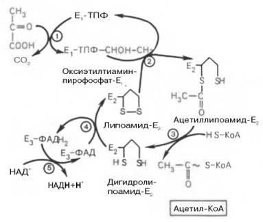 На I стадии этого процесса пируват теряет свою карбоксильную группу в результате взаимодействия с тиаминпирофосфатом (ТПФ) в составе активного центра фермента пируватдегидрогеназы (E1). На II стадии оксиэтильная группа комплекса E1–ТПФ–СНОН–СН3 окисляется с образованием ацетильной группы, которая одновременно переносится на амид липоевой кислоты (кофермент), связанной с ферментом дигидроли-поилацетилтрансферазой (Е2). Этот фермент катализирует III стадию – перенос ацетильной группы на коэнзим КоА (HS-KoA) с образованием конечного продукта ацетил-КоА, который является высокоэнергетическим (макроэргическим) соединением.