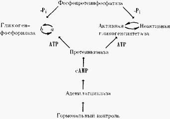 Следовательно, изображенный выше цикл синтеза и фосфоролиза гликогена следует дополнить довольно сложной схемой взаимопревращений активных и неактивных форм ферментов, катализирующих эти процессы: