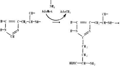 На первом этапе аденозилметионин (AdoMet), обычно являющийся донором метильной группы, выступает при алкилировании имидазольного кольца как донор фермента