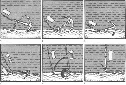 При отдаче якорь падает на дно (рис. 1, а) и буксируется движущимся судном (рис. b). При этом за счет действия штока (шток-анкер) или за счет своей формы (якорь патентованной системы) якорь поворачивается лапами к морскому дну. Если он буксируется дальше, то его лапы зарываются в землю и якорь «зацепляется» (рис. с). При подъеме якоря сначала выбирают якорную цепь (рис. d), которая постепенно принимает вертикальное положение (рис. е). В этот момент якорь отрывается от грунта, а якорная цепь испытывает большую нагрузку. После того как якорь поднят с грунта, его начинают выбирать якорной лебедкой до тех пор, пока он не окажется в якорном клюзе. Некоторые якоря для повышения силы сцепления с грунтом имеют шток - стержень, ориентированный поперек веретена. Шток может быть установлен на веретене, на лапах, на коробке якоря. Держащая сила якоря выражается через отношение его веса к тому весу, который он способен удерживать. Простейший якорь А в виде камня, обвязанного канатом, удерживает вес меньше собственного. Адмиралтейский (со штоком и неподвижными лапами) якорь малых размеров удерживает (в зависимости от особенностей его конструкции) вес в 3-12 раз больше собственного, а больших габаритов - в 5 раз больше своего веса. Якоря, не имеющие штока, удерживают: малые - в 2-3 раза больше своего веса, большие (корабельные) - в 5 раз больше своего веса; держащая сила таких якорей через некоторое время после заглубления лап в грунт возрастает по сравнению со значением ее величины сразу после отдачи. Якоря Дэнфорта удерживают: малогабаритные литые стальные - в 17-460 (в зависимости от типа грунта) раз больше своего веса; предназначенные для постоянной швартовки якоря сборной конструкции - в 30-1000 раз больше своего веса; корабельные - в 20-30 раз больше своего веса. Значение держащей силы постоянно при условии, что полностью натянутая (без провеса) якорная цепь отходит от якоря под углом 15° к горизонту. Обычно это достигается при длине цепи, в 4 раза большей глубины погружения якоря, но в зависимости от ветра и течения может потребоваться длина цепи в 10 раз больше глубины погружения.