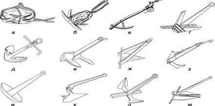 Рис 2 а - камень, обвязанный канатом; б - примитивный; в - индийский; г - китайский; д - адмиралтейский; е - бесштоковый; ж - вильчатый; з - Портера; и - грибовидный; к - плуговый; л - Нортилла; м - Дэнфорта