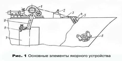 Рис. 6 - 1) Якорный механизм - устройство для подъема и отдачи (стравливания якоря); 2) и 3) якорные и цепные стопоры, служащие для закрепления якорного каната, как при стоянке на якоре, так и в "походном" положении; 4) якорный канат, передающий усилие от корпуса судна к якорю и используемый для подъема и отдачи якоря; 5) якорные клюзы позволяющие проходить якорному канату при отдаче и подъему якоря; 6) якорь, обеспечивающий удержание судна в заданном положении; 7) цепной (канатный) ящик для размещения якорного каната; 8) жвакогалс - устройство для крепления коренного конца якорь цепи к корпусу судна; 9) палубный клюз для прохода якорь цепи от брашпиля в цепной (канатный) ящик