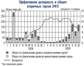 В январе-апреле в условиях сохранявшейся нестабильности на российском финансовом рынке спрос участников рынка ОФЗ был крайне низким. В январе гособлигации на аукционах покупали лишь крупнейшие консервативные инвесторы. В феврале эмитент был вынужден отменить 2 аукциона, а в апреле признать 2 аукциона несостоявшимися. С мая в условиях роста банковской ликвидности ситуация на первичном рынке стала улучшаться, и до июля наблюдался устойчивый, но весьма умеренный спрос на размещаемые выпуски ОФЗ. С июля спрос стал расти, достигнув максимума в октябре, а затем, несколько снизившись, сохранялся на достаточно высоком уровне до конца 2009 года. На вторичном рынке в 2009 г. периодически проводились аукционы по доразмещению гособлигаций. До начала сентября эмитент размещал гособлигации на аукционах преимущественно с премией к их доходности на вторичном рынке, а затем со значительным дисконтом.