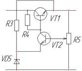Для отримання рівномірних імпульсів із однаковою амплітудою струм, що надходить на формувач, повинен бути урівноважений, тобто стабілізований. Саме для цього призначений компенсаційний стабілізатор. У даній схемі використаний компенсаційний стабілізатор послідовного типу (послідовний, тому що регулюючий елемент підключено послідовно з опором навантаження), оскільки даний тип має більший коефіцієнт корисної дії у порівнянні з стабілізатором паралельного типу. Стабілізаційний вузол зображений на рис. 4.3. У даній схемі транзистор VT1 виконує роль регулюючого елемента. Транзистор VT2 являється одночасно підсилюючим та порівнюючим елементом. Джерелом опорної напруги, з якою порівнюється вхідна напруга, являється параметричний стабілізатор VD5. Якщо через нестабільність вхідної напруги значення вихідної відхилилося від свого номінального значення, то різність опорної та вихідної напруг змінюється. Ця напруга підсилюється транзистором VT2 і діє на регулюючий транзистор, змінюючи його провідність. Тоді вхідна напруга розподілиться між регулюючим транзистором та опором навантаження таким чином, щоб скомпенсувати втрати на навантаженні.