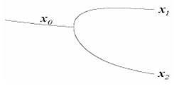 Характерной иллюстрацией возможных бифуркаций в системе служит бифуркационное дерево, представляющее собой зависимость возможных дискретных значений динамической переменной на аттракторе от параметра. Типичный пример такого дерева, построенного с помощью компьютера, показан на рисунке. Приведенный пример относится к одной из эталонных моделей нелинейной динамики – логистическому отображению . Наше аналитическое рассмотрение позволяет нарисовать начальный участок дерева (рис. 1)