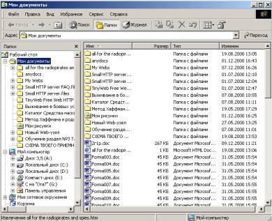 Программа Проводник управляет файлами и обеспечивает один из наиболее удобных способов просмотра файловой системы. В случае, когда требуется открыть, скопировать, переместить, удалить, переименовать или переупорядочить папки или (и) файлы, есть возможность либо воспользоваться программой Проводник, либо работать с папками и файлами непосредственно на Рабочем столе. Основное преимущество программы Проводник, по сравнению с окнами папок на Рабочем столе, состоит в том, что в программе Проводник можно одновременно работать с содержимым правой панели окна и со всей структурой файловой системы вашего компьютера ≈левой панели (рис. 1.5). Это значительно облегчает копирование файлов из правой панели на логический диск или в папку, находящиеся на левой панели. При этом нет необходимости открывать большое число окон, как это при╜шлось бы делать на Рабочем столе. Наиболее удобным приемом является открытие двух окон программы Проводник, упорядоченных по вертикали или по горизонтали.