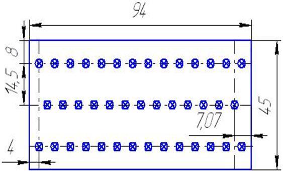 При разметке мест установки светильников, учитываем, что расстояние от стен при заданной ширине помещения (45м) и расположении ламп в 3 ряда должно составлять 7-8м