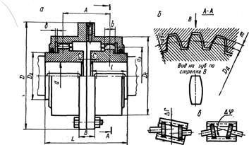 Считают, что нагрузка распределяется равномерно между всеми зубьями и что контакт зубьев происходит в пределах всей длины bи рабочей высоты h=l*m+0,8m, которая складывается из высот головок зуба втулки и зуба обоймы.Муфта рассчитывается из условия прочности смятие