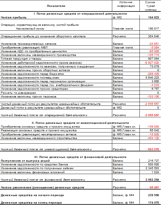 Источниками информации для анализа и расчета денежного потока косвенным методом является отчетный бухгалтерский баланс и отчет о прибылях и убытках. Расчет чистого денежного потока при косвенном методе осуществляется по видам деятельности (операционной, инвестиционной, финансовой) и в целом по предприятию.