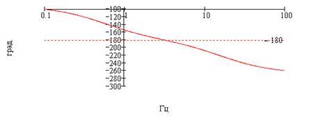 А вот запас устойчивости по фазе не является достаточным. Т.к. ЛАХ пересекает 0 на , значение ФЧХ на этой частоте Град. Что не удовлетворяет условию достаточной системы