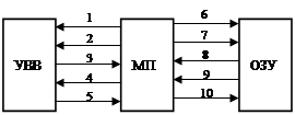 На рис.4 представлена общая схема взаимодействия микропроцессора МП с устройствами ввода – вывода УВВ и ОЗУ в микропроцессорной системе. Связь МП с УВВ требует пяти групп связи, обеспечиваемых через выводы корпуса. По группе шин 1 передается код выбора (адреса) устройства, по шине 2 – сигнал управления считыванием – записью, по шине 3 – сигнал запроса на прерывания, шины 4 и 5 используются для передачи данных от процессора к УВВ и от УВВ к МП. Связь МП с ОЗУ также содержит пять групп связей, которые необходимо обеспечить через выводы корпуса МП. По группе шин 6 передается адрес в ОЗУ, шина 7 нужна для управления чтением/записью, по сигналам на шине 8 принимаются команды в процессор, а шины 9 и 10 обеспечивают передачу данных из ОЗУ в МП и обратно.