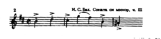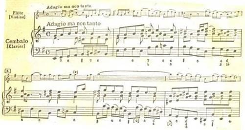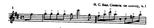 Одной из лучших сонат Баха для флейты является соната ми минор. Первая часть,Adagiomanontanto,- неторопливая, глубокая по своему эмоциональному содержанию музыка, требующая от исполнителя зрелого мастерства, понимания стилевых особенностей творчества композитора. Развитие тематического материала, сопровождаемое динамическим нарастанием, образует как бы четыре большие звуковые волны, следующие одна за другой.